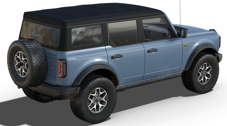 - Includes black molded-in-color (MIC) door handles, black molded-in-color (MIC) fender flares, black-painted molded-in-color (MIC) grille with white Bronco lettering, black molded-in-color (MIC) sideview mirror caps, black appearance graphics package, 17 inch black high gloss painted aluminum wheels, and Shadow Black painted hard top.